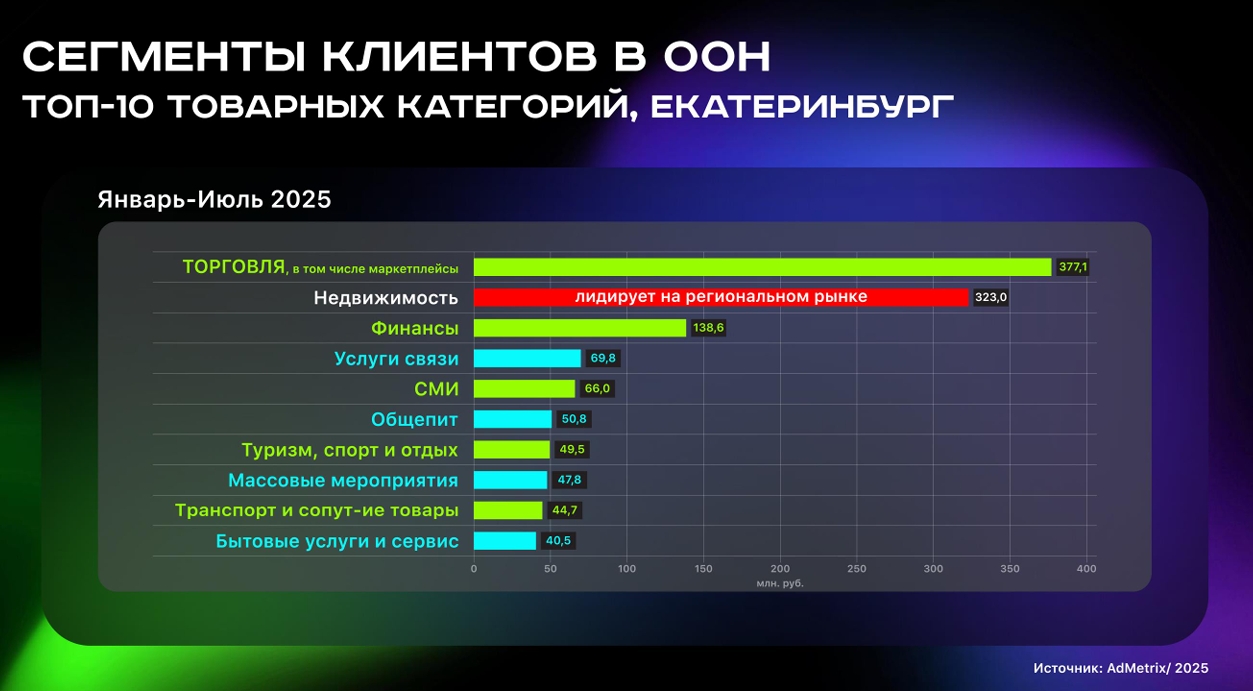 Сегмент недвижимости и строительства занимает второе место по объему инвестиций в наружную рекламу Екатеринбурга и уступает только торговле и маркетплейсам, отмечают эксперты. При этом если смотреть исключительно на местные рекламные бюджеты, то лидируют девелоперы. Торговля и маркетплейсы — это как правило федеральные рекламодатели.